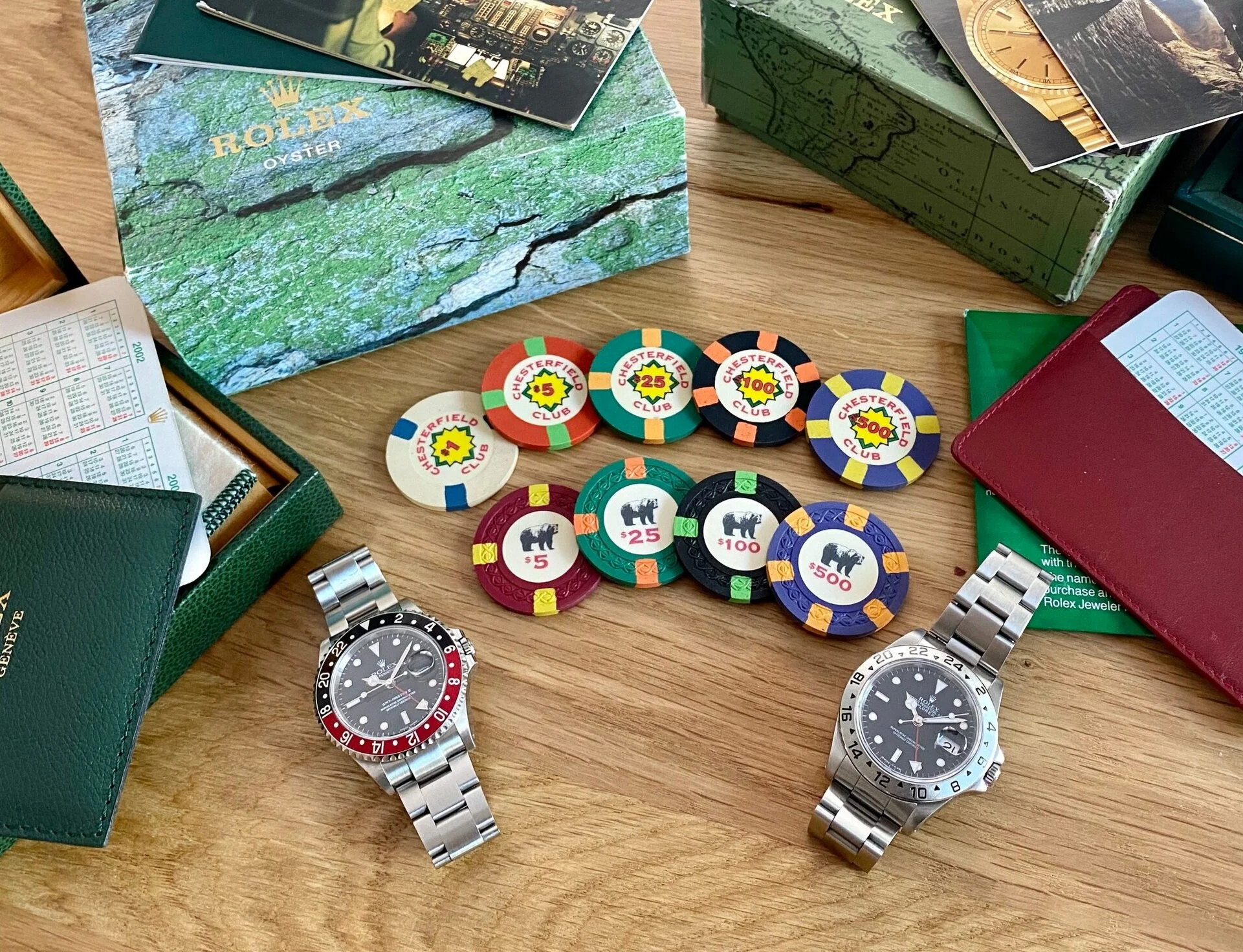 Jesse’s GMT-Master II “Coke” ref. 16710, with his Rolex 16570 and poker chips used in the movie Rounders | Photo courtesy of Jesse Johnson