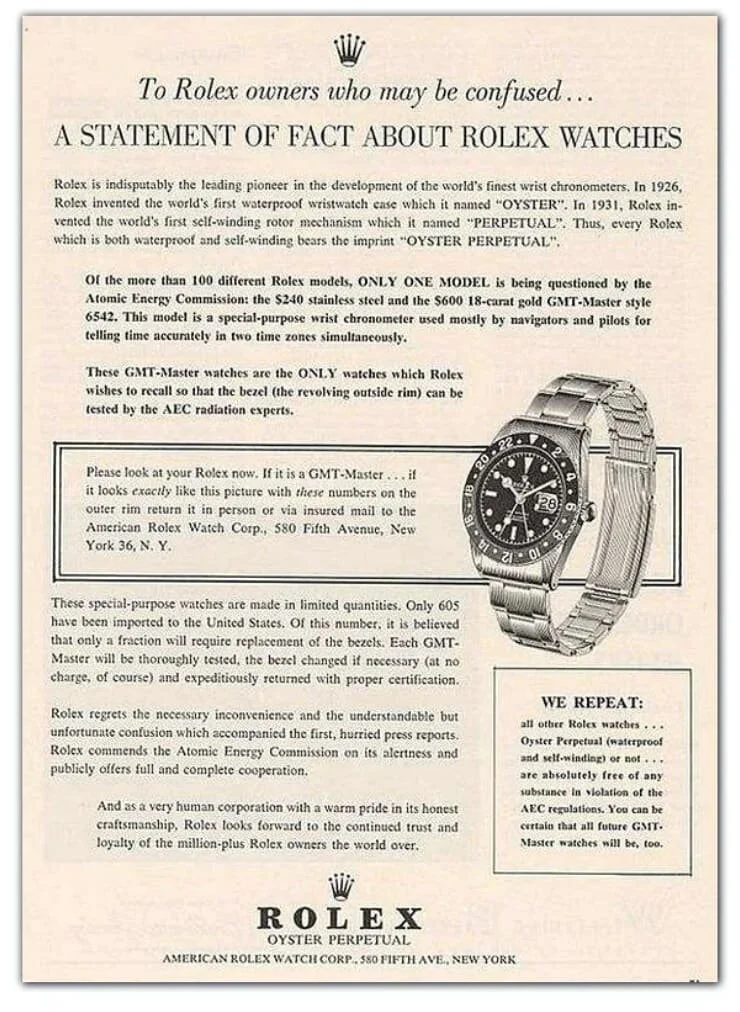 Rolex was one of the companies notified by the AEC that a GMT-Master purchased in Singapore contained strontium. It embarked on a nationwide search to reclaim this reference. The AEC licensed Rolex’s headquarters in New York City at 580 Fifth Avenue to receive watches and, under supervision of a commission inspector, test them for strontium. Out of 250 watches received, approximately 185 were hazardous and required replacement of radioactive parts.