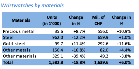 The total value of exports was significantly boosted by a steep rise in precious metal and bimetal watch exports. Meanwhile, steel production was up just 1%. In volume terms, this meant a particularly weak March, with total volumes down 18.8%. In the space of the last three months, export volume has fallen by nearly 800,000 pieces.