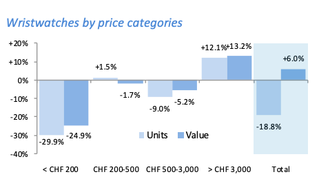 As has been typical, watches on the low end of the price spectrum saw a decline, with those priced less than CHF 200 down 24.9% in value exported. Meanwhile, pieces above CHF 3,000 had a particularly strong month, with total export value up 13.2%. These numbers help explain why total export value was up while total number of timepieces exported was down (apparently people love their expensive precious metal or bimetal pieces right now).
